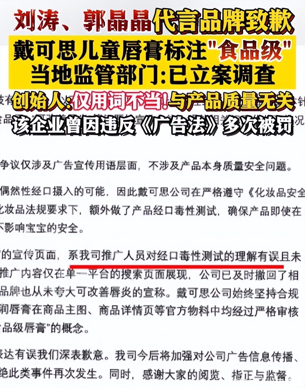 她与婴童护理品牌戴可思的合作已持续四年之久,单就这一项合作所获收益已相当可观。但就在2026年1月,该品牌一款主打儿童使用的润唇膏,因擅自标注“食品级”字样,涉嫌违反《儿童化妆品监督管理规定》,被无锡市市场监督管理局正式立案调查——而这已是其继2025年底因夸大功效宣传遭行政处罚后,短短数月内再度触碰监管红线。