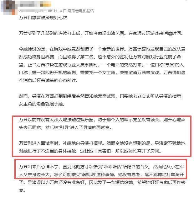听说万茜以前刚去一个剧组试戏时,就有人跟她讲,只要乖乖听导演安排,女主角这个角色肯定就是她的了。老手一进这地儿,一听就觉出不对劲了,按导演说的做,就能让刚入行的小演员我拿到女主角的位置,这简直太棒啦!