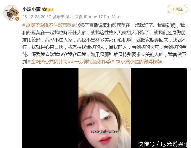 这波“自我剖析”还没完,她随即透露已主动发信息邀请彭冠英来杭州合拍视频,算是给“荧幕CP”粉一个交代。可网友的耐心,似乎早已被消耗殆尽。仔细一算,这已经是赵樱子这个月第三次因情感话题引发争议了:12月初刚高调官宣“小12岁男友”,没过多久就被扒出“蒋毅求婚”剧本翻车、狼狈删视频;如今话题一转,又拉上了老搭档彭冠英。一连串操作被网友犀利总结为“情怀消耗链”:从国民剧初恋到“疯批”话题女王,如今连“林多美”眼里的光,在部分观众看来都只剩下了流量计算的精明。