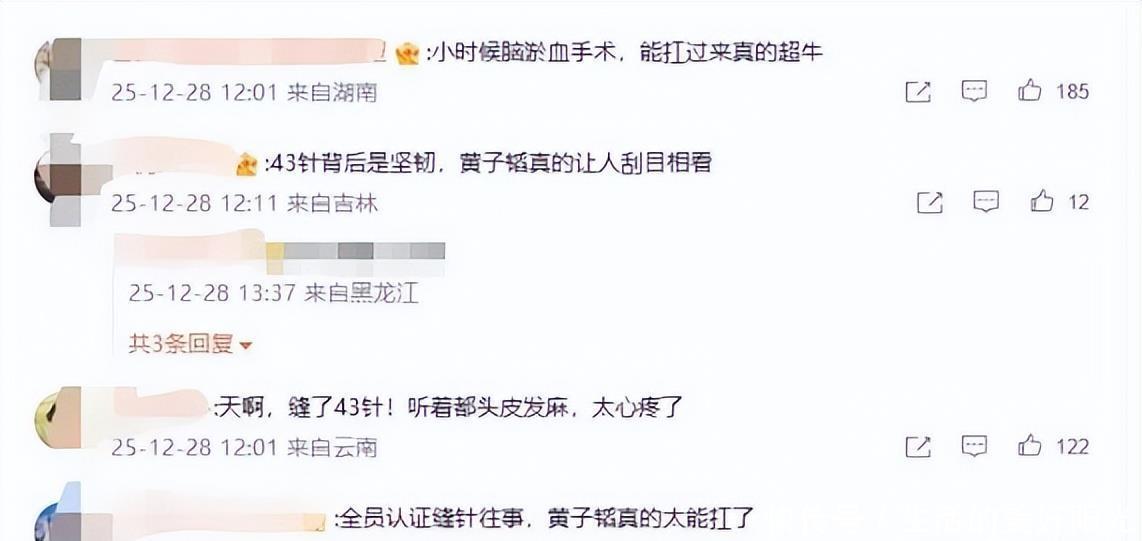 据了解,这场手术源于黄子岁习武时的意外摔倒,彼时他引发脑淤血(医学称脑出血),淤血压迫脑组织,医生曾警告,若晚几分钟手术,可能造成智力损伤甚至成为植物人。手术需掀开头皮开颅清淤,创口最终缝针。这番经历曝光后,网友纷纷留言心疼,有人直呼“缝针听着都头皮发麻,太心疼了”,更有网友称赞他“历经重病依旧高能量,黄子韬内娱拼命三郎”“心疼黄子韬遭这份罪,术后满血回归太牛了”。